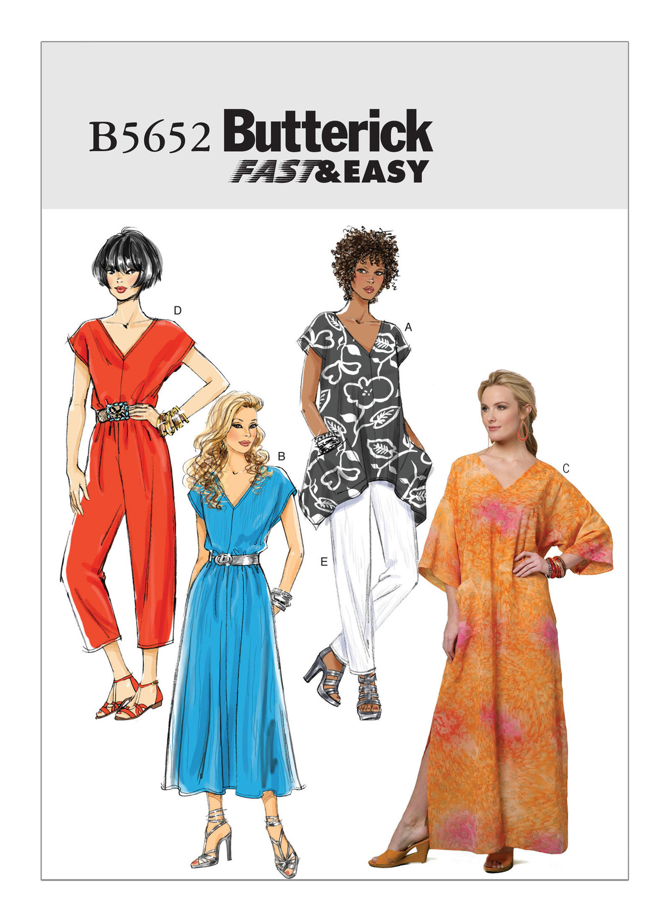 B5652 Misses V Neck Top Dress Caftan Jumpsuit And Pants Butterick Patterns
